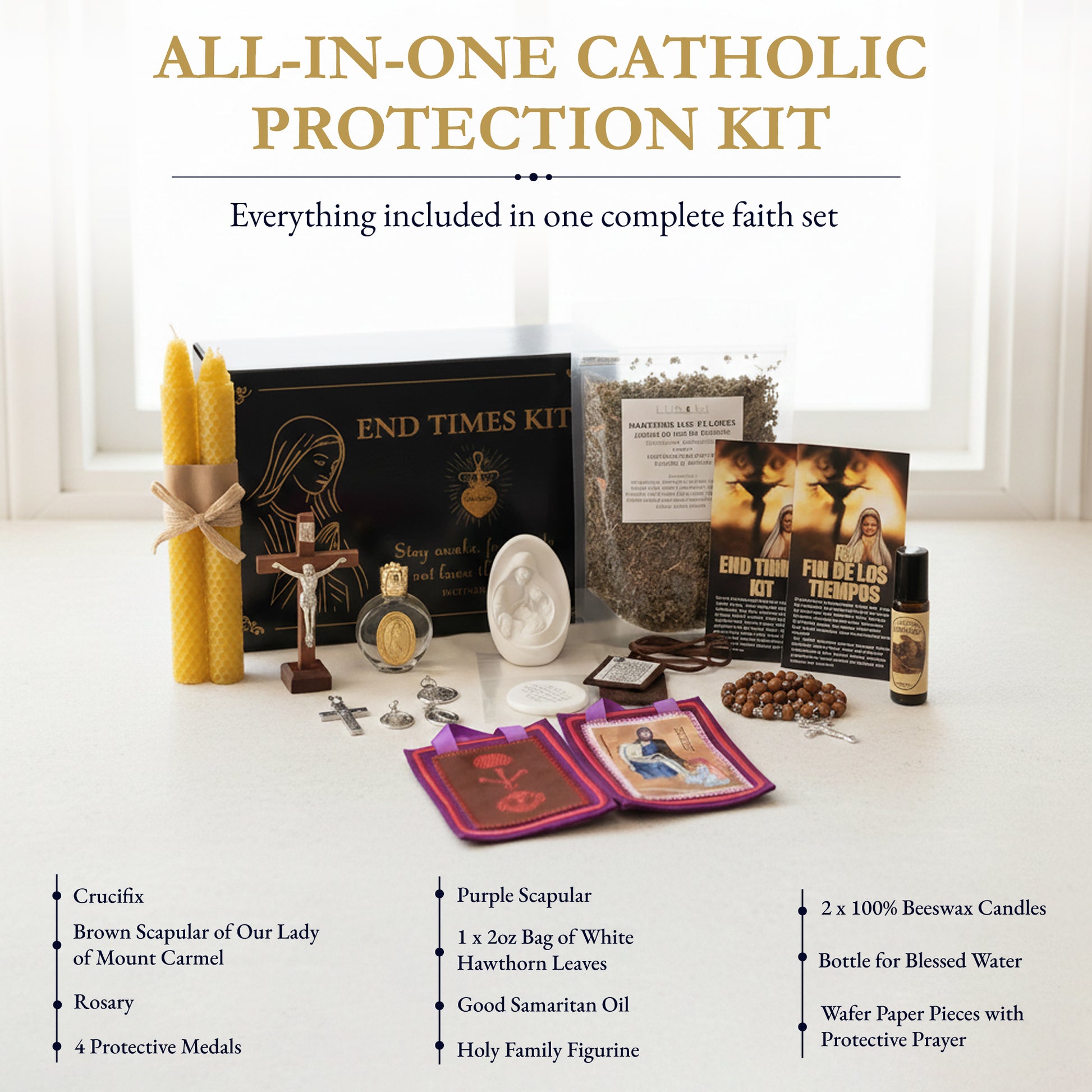 This End Times Kit is a complete Catholic devotional set designed to help you and your loved ones stay spiritually prepared during times of trial. It is ideal for individuals, families, and prayer groups seeking peace, protection, and deeper faith in uncertain times.